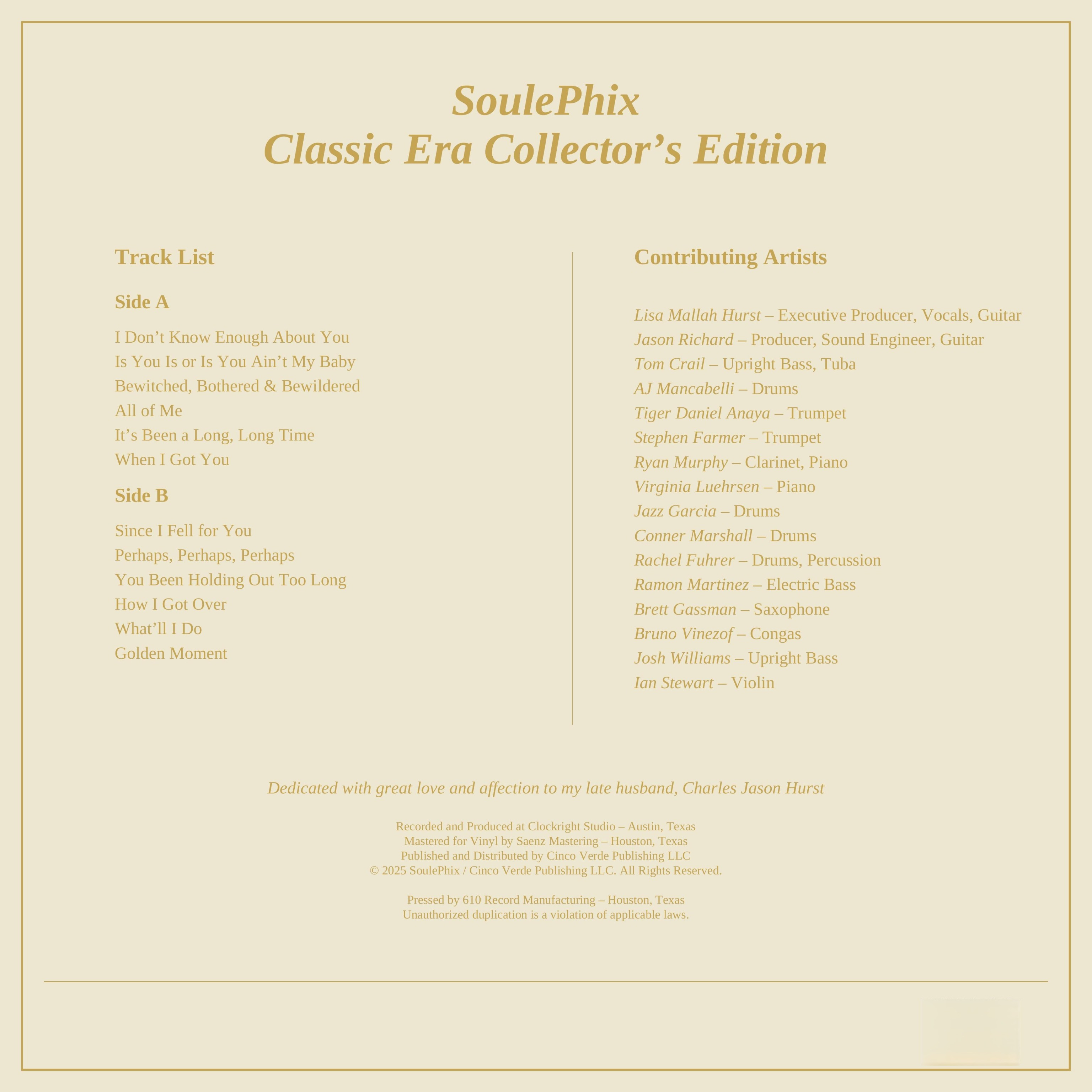 As an artist who records both digitally and analog, I believe there’s room for both worlds. Digital offers accessibility and precision. Analog offers emotion and depth. One delivers reach; the other delivers resonance. The challenge is to balance them—to capture music in its purest analog form and then share it through the digital pathways that connect us all. That’s what I sought to do with the SoulePhix – Classic Era Collector’s Edition vinyl LP. It is a return to warmth, to truth, to the tactile beauty of recorded sound.